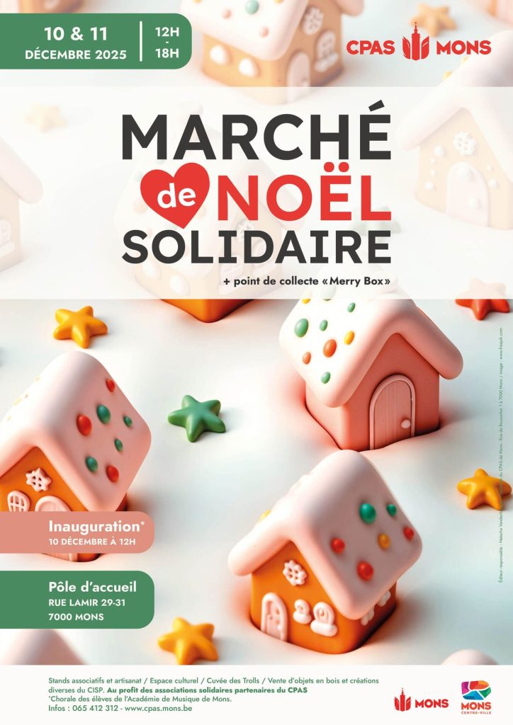 mercredi 10 et jeudi 11 décembre : 12h-18h : Pôle d’Accueil (29-31 rue Lamir 7000 Mons) : Marché de Noël solidaire du CPAS de Mons. Au profit des associations partenaires du CPAS. Inauguration le 10 décembre à 12h.